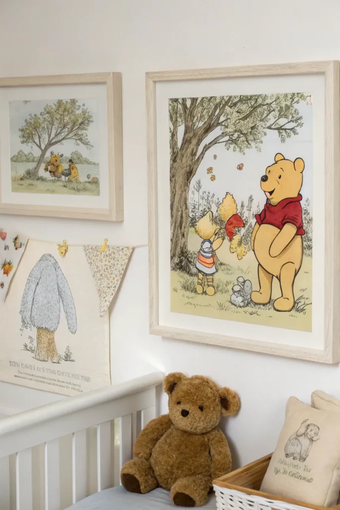One of the easiest ways to introduce the theme is through wall art. Choose classic illustrations from the original Winnie the Pooh books rather than bold, modern cartoons for a more timeless look. Framed prints featuring Pooh, Piglet, Tigger, and Eeyore add character while keeping the room soft and gentle. Arrange the artwork in a gallery wall above the crib or changing table to create a charming focal point that feels straight out of a storybook.