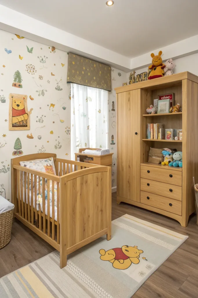 Natural wood furniture pairs beautifully with a Winnie the Pooh theme. Cribs, dressers, and shelves in light oak or warm wood tones echo the rustic charm of the forest setting. Wooden furniture adds warmth and durability, making it a long-lasting choice. This timeless style also allows you to reuse the furniture later in a toddler or children’s room without needing to redecorate completely.