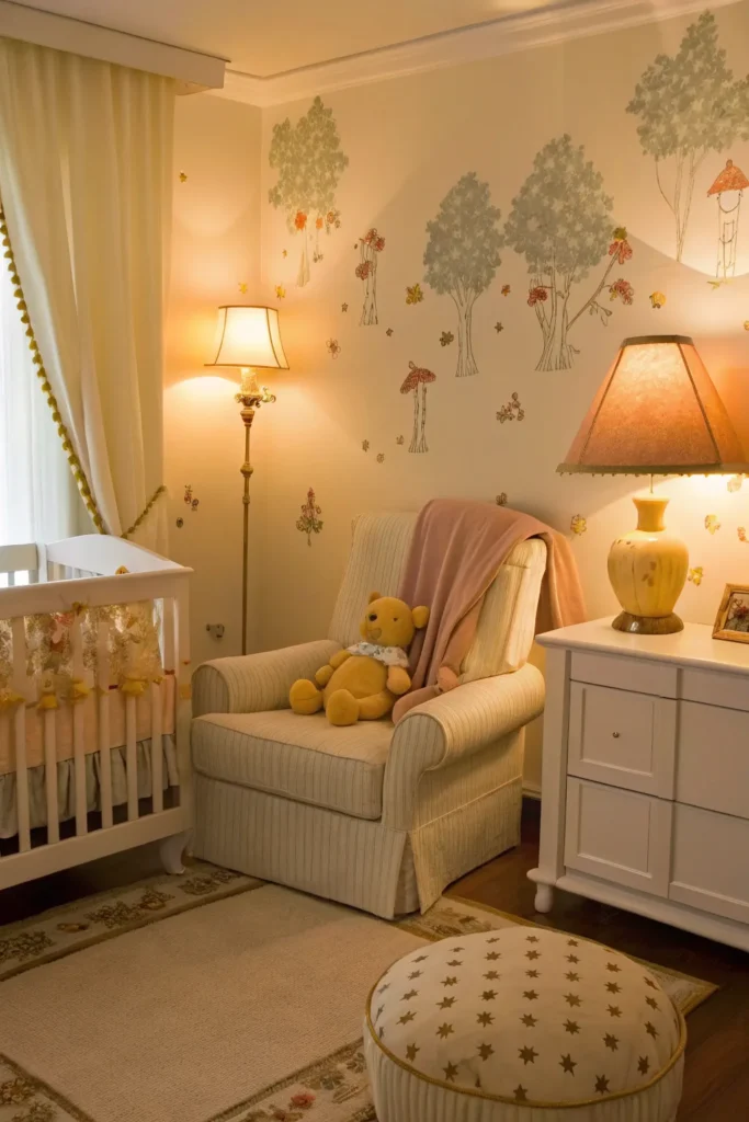 Lighting plays a crucial role in setting the mood of a nursery. Choose warm, soft lighting through table lamps, wall sconces, or a dimmable ceiling light. A Pooh-themed night light can add a comforting glow during nighttime feedings and diaper changes. Soft lighting helps create a soothing environment that supports better sleep for your baby.