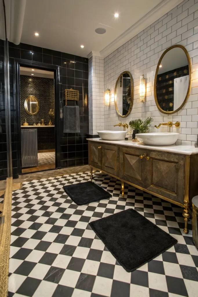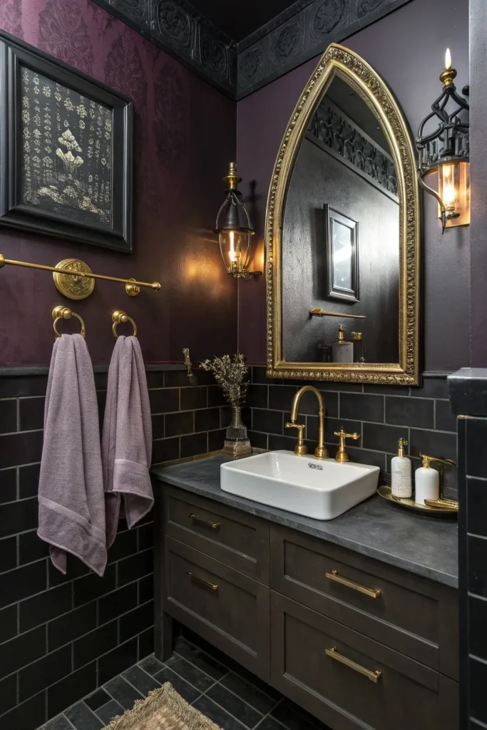 Deep shades of black, charcoal, or deep plum instantly set the stage for a witchy bathroom. Pair with gold or brass fixtures for a modern yet mystical touch.