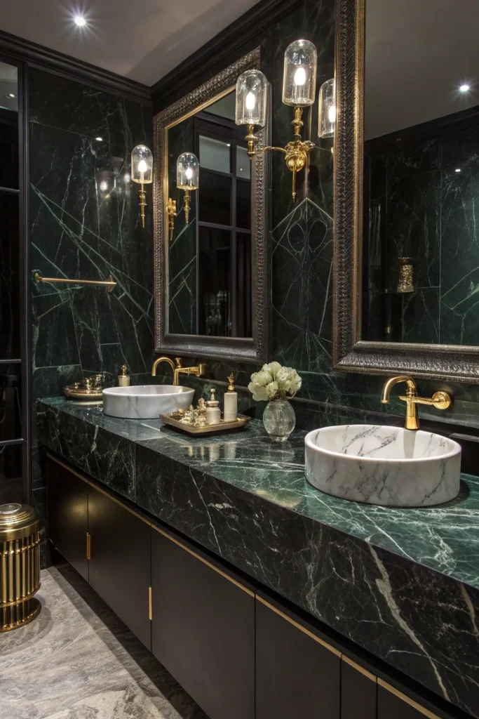 Luxurious and moody, dark marble surfaces scream witchy chic while keeping it modern.