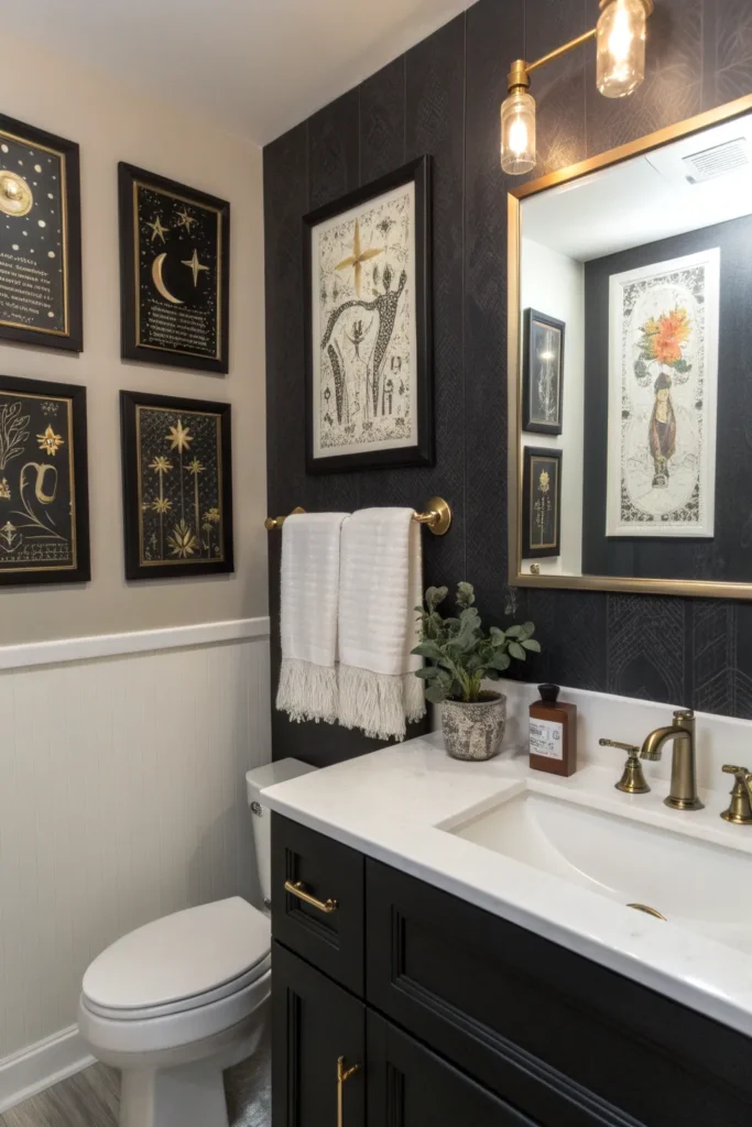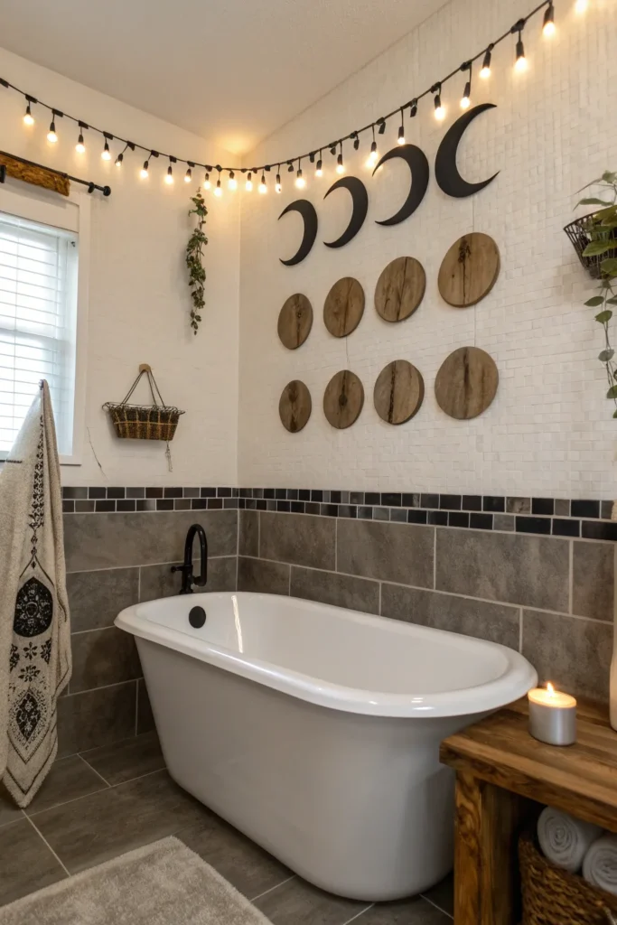 A classic witchy touch is moon décor. Hang moon phase art above the tub or toilet for a mystical vibe.