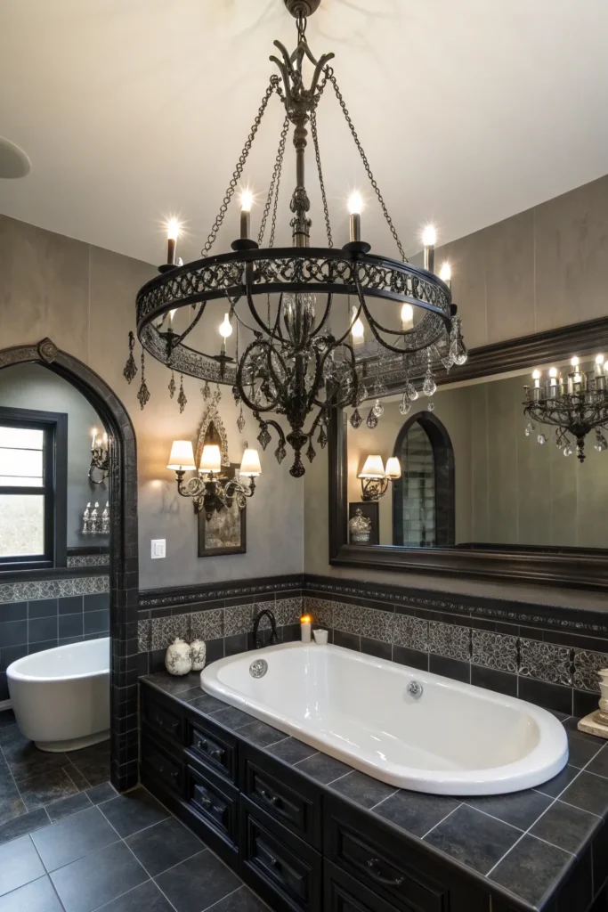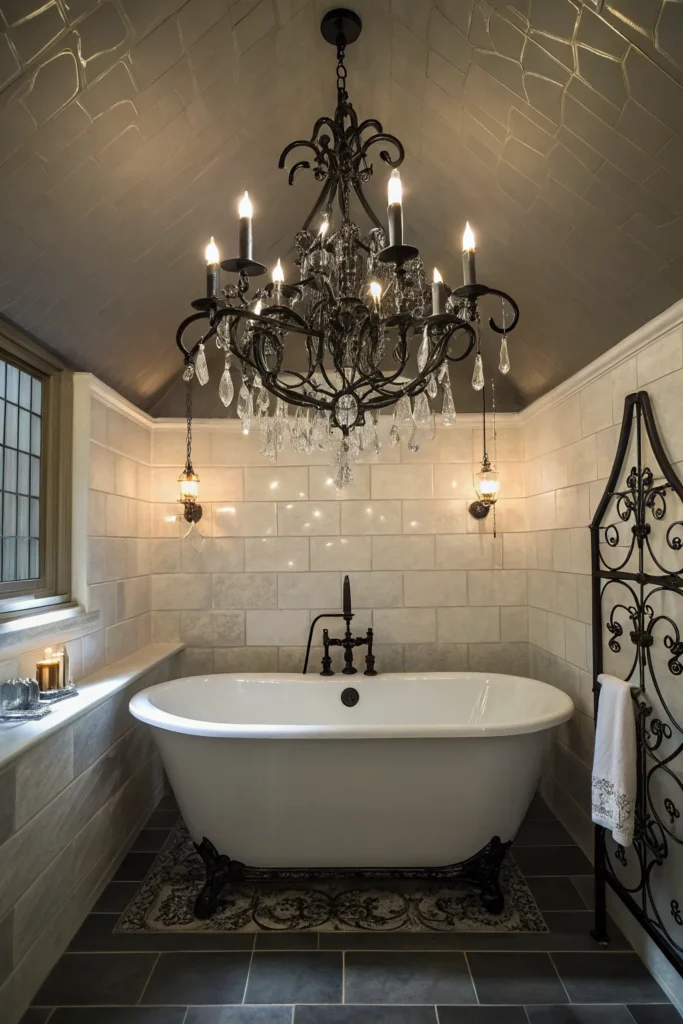 For the ultimate witchy statement, add a chandelier above your bathtub. It gives an instant mystical drama.