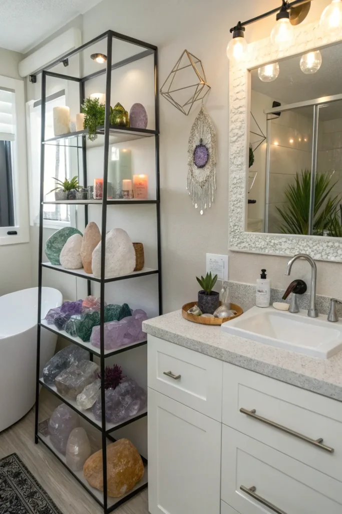 Crystals radiate energy and add that magical aura. A shelf above the sink or tub with glowing crystals looks beautiful and meaningful.