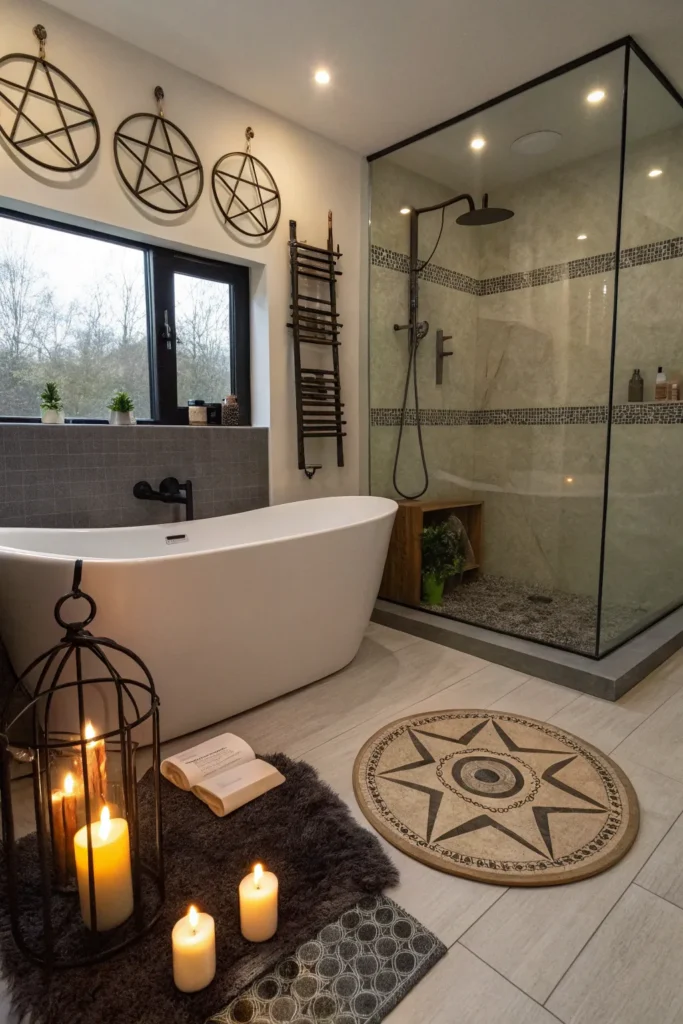 A witchy bathroom isn’t just about one or two items – it’s about creating a whole room view that feels like a sanctuary. Below are 15 ideas that help you transform your bathroom into an enchanting, modern witchy retreat.