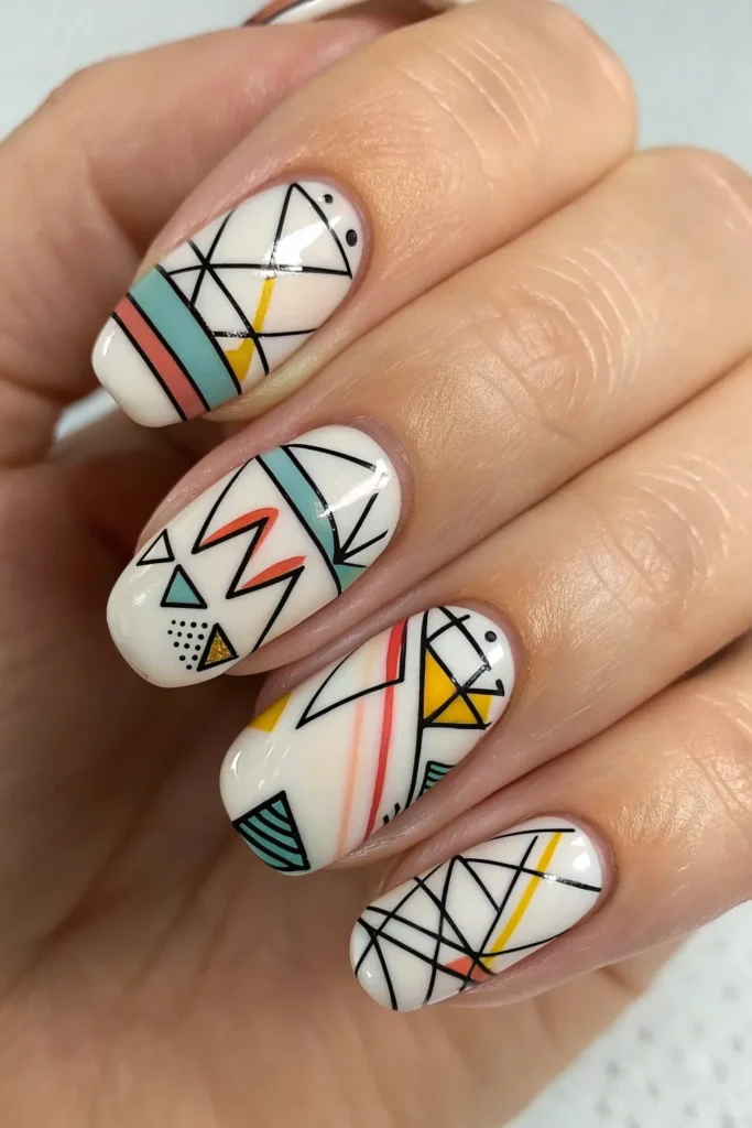 Go for geometric lines, triangles, or overlapping shapes in both colors. The design feels creative and chic without being too busy.