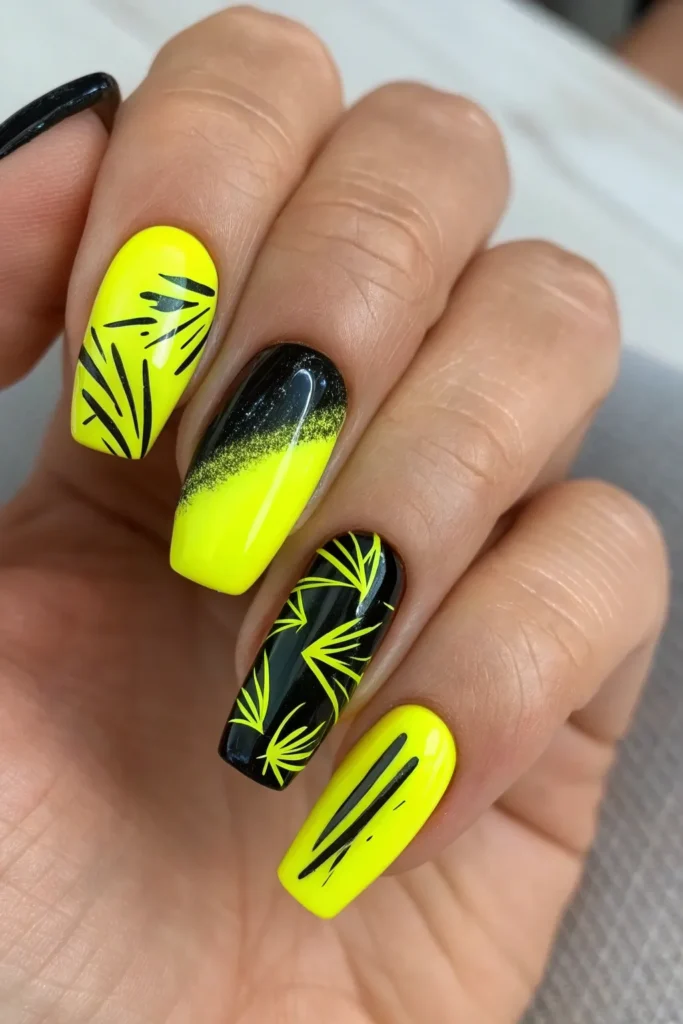 Paint most nails neon yellow and keep one or two nails black with abstract yellow streaks. It’s eye-catching and trendy, perfect for summer.