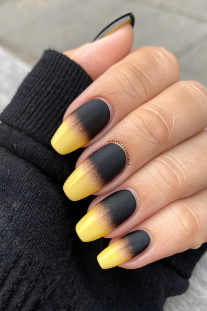 Blend black from the cuticle into yellow at the tips to create a smoky gradient effect. It’s subtle, smooth, and adds depth.