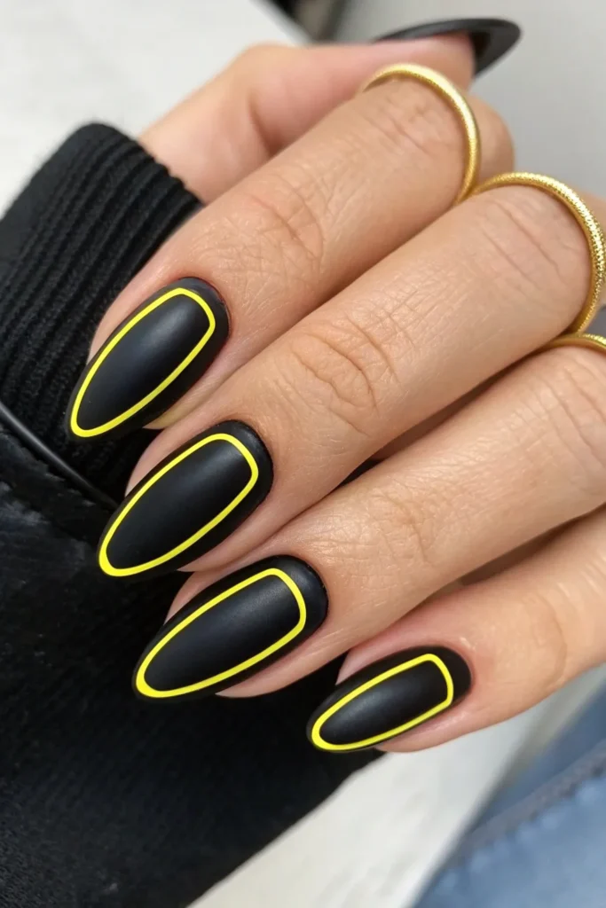 Paint nails black and use yellow polish to outline the edges of each nail. This minimalist yet futuristic look adds a sleek pop of contrast.