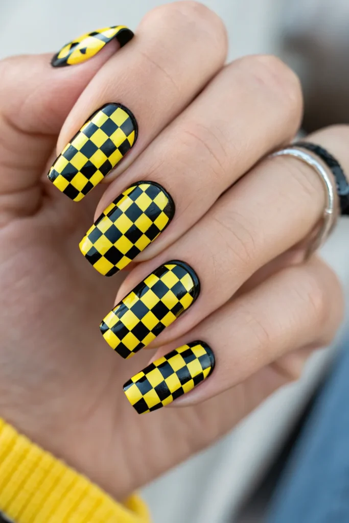 Mix yellow and black checkerboard designs on alternating nails. This bold, graphic pattern is full of personality and gives a trendy edge.