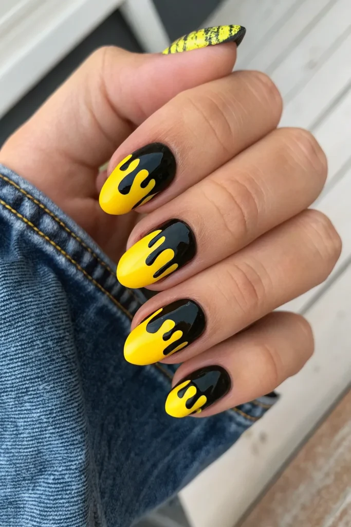 Recreate a dripping paint look by blending yellow polish that appears to drip over black, or vice versa. It gives off a creative, edgy vibe.
