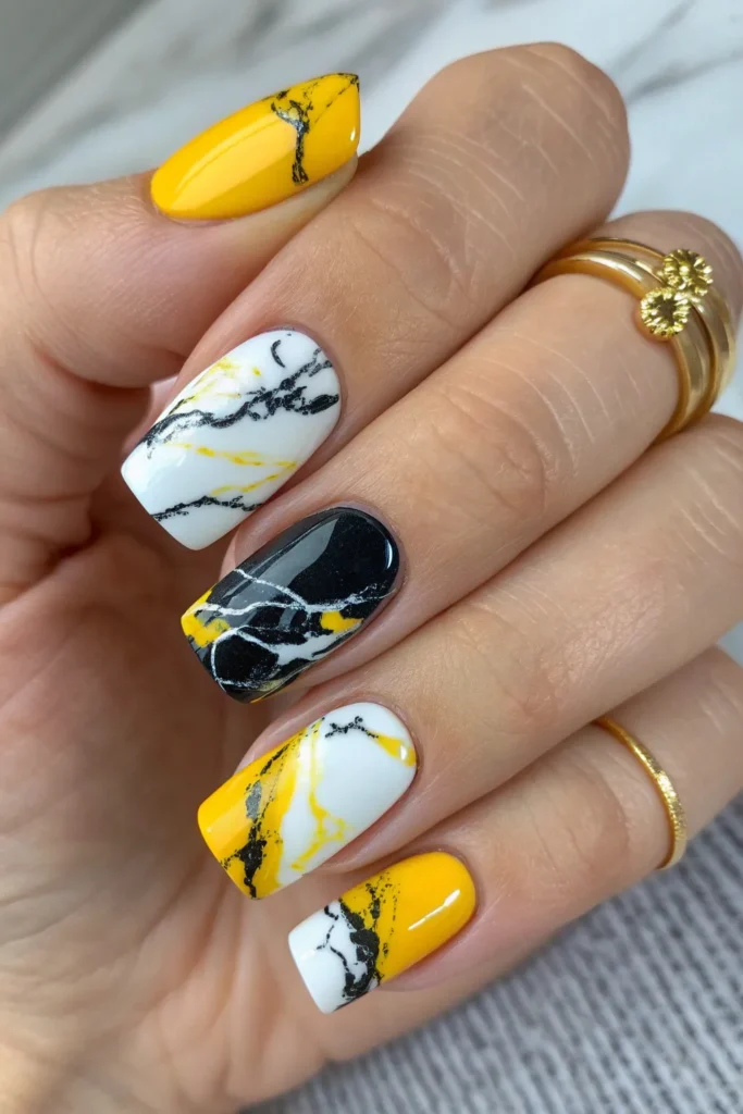Blend yellow, black, and white polish to create a marble effect. The combination of colors gives a sophisticated yet bold result.